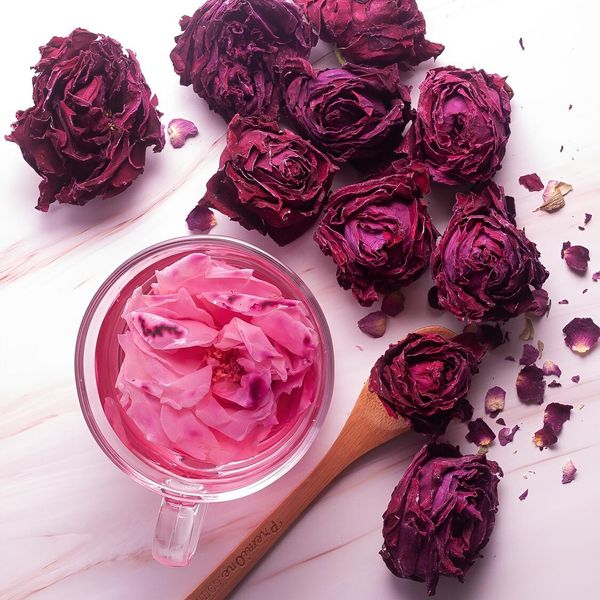 墨紅玫瑰花源於法國,獨特的形態特徵,植株高約60cm,花朵重瓣30-35枚,花徑10-12cm,花瓣墨水一樣的紅得烏黑,所以叫墨紅玫瑰,自身色素含量高,有絲絨般的質感,花香濃郁純正。用墨紅玫瑰泡茶,花香濃郁,芬芳撲鼻,飲用口感順滑,玫瑰的香氣在口中回甘,舒暢直達心間,味道甘甜、純正,隨著泡水時間增長,花香會緩緩釋放,越來越濃。
