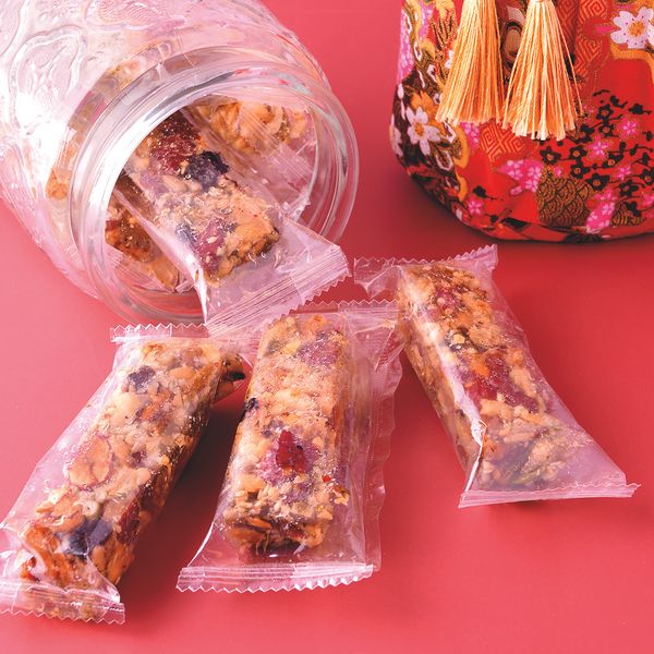成份:花生、紅棗、合桃、南瓜籽、葡萄乾、黑桑葚、杏仁、白芝麻、麥芽糖醇