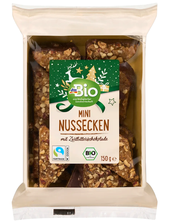 聖誕節有了dmBio,美味更上一層樓! dmBio迷你榛果片是聖誕季的經典美味。這些有機糕點選用香氣濃鬱的榛果製成,並點綴以黑巧克力碎,帶來一絲巧克力的醇香。小巧精緻,是咖啡或茶的完美伴侶,也是任何餅乾拼盤的甜蜜點綴。它們也是饋贈親友的貼心小禮物,或是居家休閒時的甜蜜小食,讓節日更加溫馨愉悅。