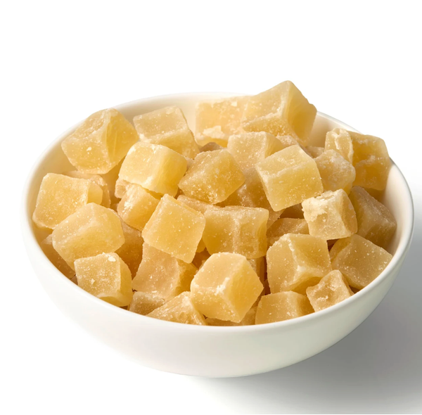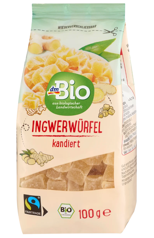dmBio的蜜餞薑粒是一款美味的純素零食。其濃鬱的香氣使其成為糖果、甜點和果醬的理想配料。這些蜜餞薑塊甜辣適中,表面裹著一層細膩的糖粉——是快速補充能量的完美選擇,用途也十分廣泛。