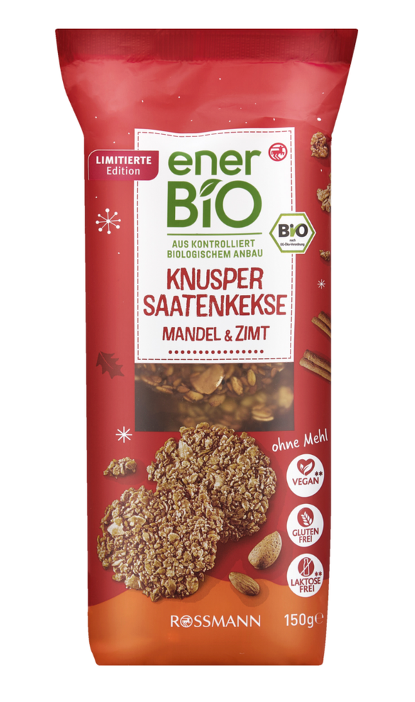 enerBiO杏仁肉桂籽餅乾,採用優質有機原料製成,口感酥脆,融合了芳香的杏仁、營養豐富的籽粒和淡淡的肉桂香。隨時隨地,都是理想的零食之選。體驗堅果的香甜與辛香的完美融合!