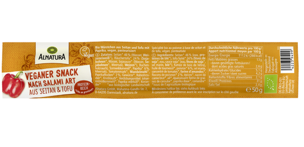 這款富含蛋白質的純素零食由豆腐和麵筋(小麥蛋白)製成,帶有鹹香辛辣的薩拉米風味。實用的包裝使其成為理想的旅行伴侶和休閒小吃。 Alnatura 這款耐儲存的純素薩拉米風味零食的所有農產品均按照有機標準種植。