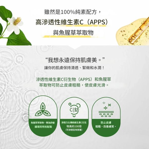- 持續亮白:日夜持續提供維他命C護理,提亮膚色,預防斑點與暗沉。