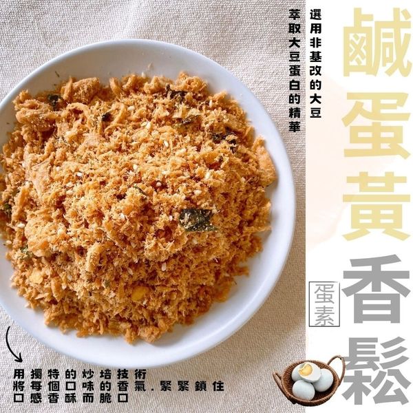 以海中珍寶 - 海苔及大豆烘焙製素香鬆,再配上鹹蛋黃,讓人念念不忘的酥香滋味,顛覆傳統將綿密的酥香的鹹蛋黃均勻的加入素鬆內,每一口鬆都散發出濃濃蛋黃的口感~和海苔素鬆的多元層次風味讓您絕對要體驗這驚奇的口感!讓你會一口接一口!
