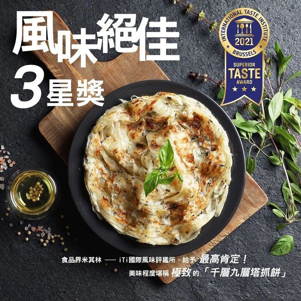 食用方式:熱鍋後加入些許食用油 (不加亦可,即白鑊),再將千層抓餅 (不需解凍)下鍋,用中小火每隔10~15秒多次翻面,煎至餅皮呈現金黃色即可享用。使用夾子與鍋鏟順時針由外向內推擠,餅皮層次分明更蓬鬆、酥脆。可根據個人喜好加入蛋、蔬菜等食材,美味營養又健康。