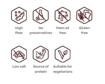 色高纖維、高蛋白質 (蛋白質含量達29%)、無添加糖、無甜味劑、無防腐劑、不含乳製品及乳糖、適合素食者。質地軟身,方便咀嚼。