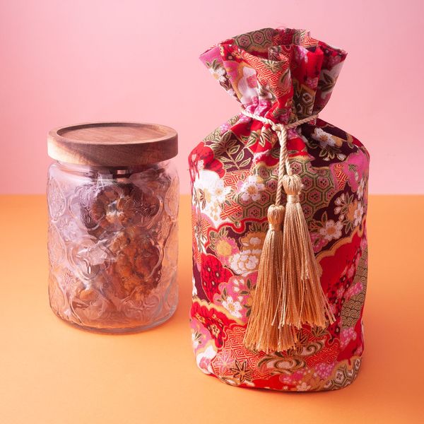 為貫切環保原則,今年我們特別訂製了一個非常精緻的玻璃密氣樽及日式索口袋作為這份小禮物的包裝,這個玻璃密氣樽除了可以放零食外,還可以放其他花果茶葉或食材,而日式索口袋則可用來放小物或利是,無論送禮或自用都既美觀又實用!新年放在全盒旁亦非常漂亮呢!