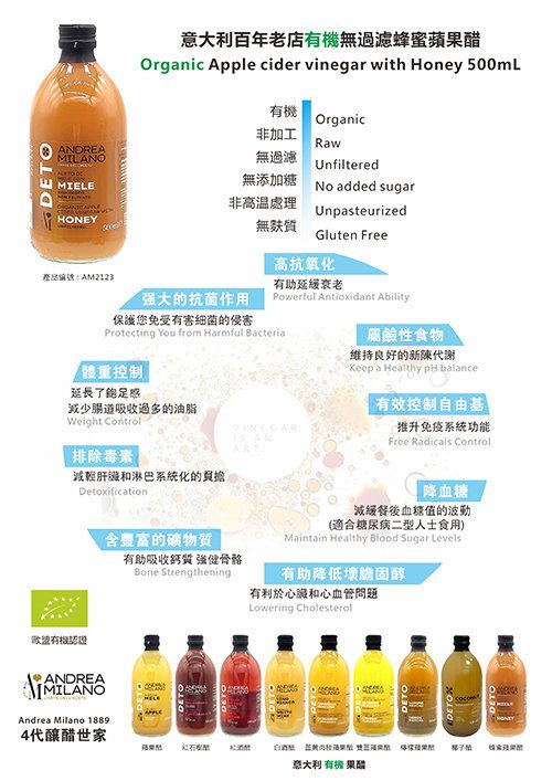 意大利百年老店Andrea Milano在1889年成立,是最古老的讓醋製造商,百年來一直按照傳統方法釀製,生產最優質的有機蘋果醋。產品已通過有機認證,清真認證。