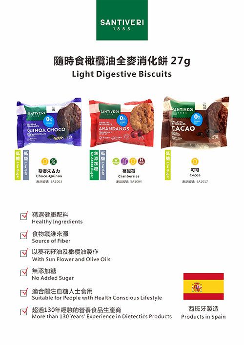 Santiveri系列的餅食都是以健康的配料為主旨的,由超過130年經驗的營養食品生產商生產,是關注健康、血糖人士很好的選擇!這款是蔓越莓口味,喜歡果乾嘅朋友一定要試試!