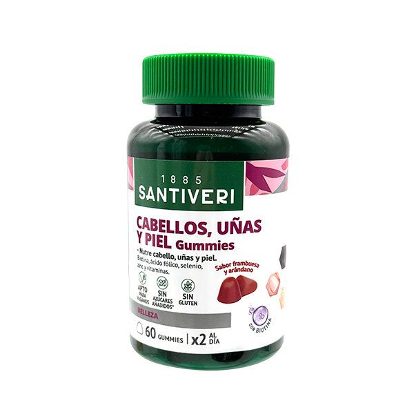 Santiveri 頭髮、指甲和皮膚軟糖是一款功能性的零食,含有維他命 A、D3、E、C、B5、B6、生物素、B9、B12、鋅、碘、硒、肌醇和膽鹼,是專為修護頭髮、指甲及皮膚而設計,是一款美味又方便的營養補充品。