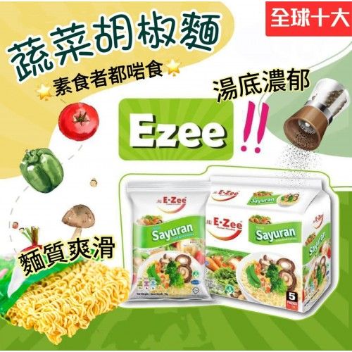 E-zee蔬菜胡椒麵是馬來西亞生產的一款素食方便麵,以其獨特的黑白胡椒風味和全小麥麵條聞名。E-zee 蔬菜胡椒麵有意想不到嘅胡椒辣感,胡椒香味撲鼻,素菜麵口感爽滑,黑白胡椒調味料濃郁鮮味,這款產品已連續五年被評選為全球前十名的素食方便麵,主要特點包括: